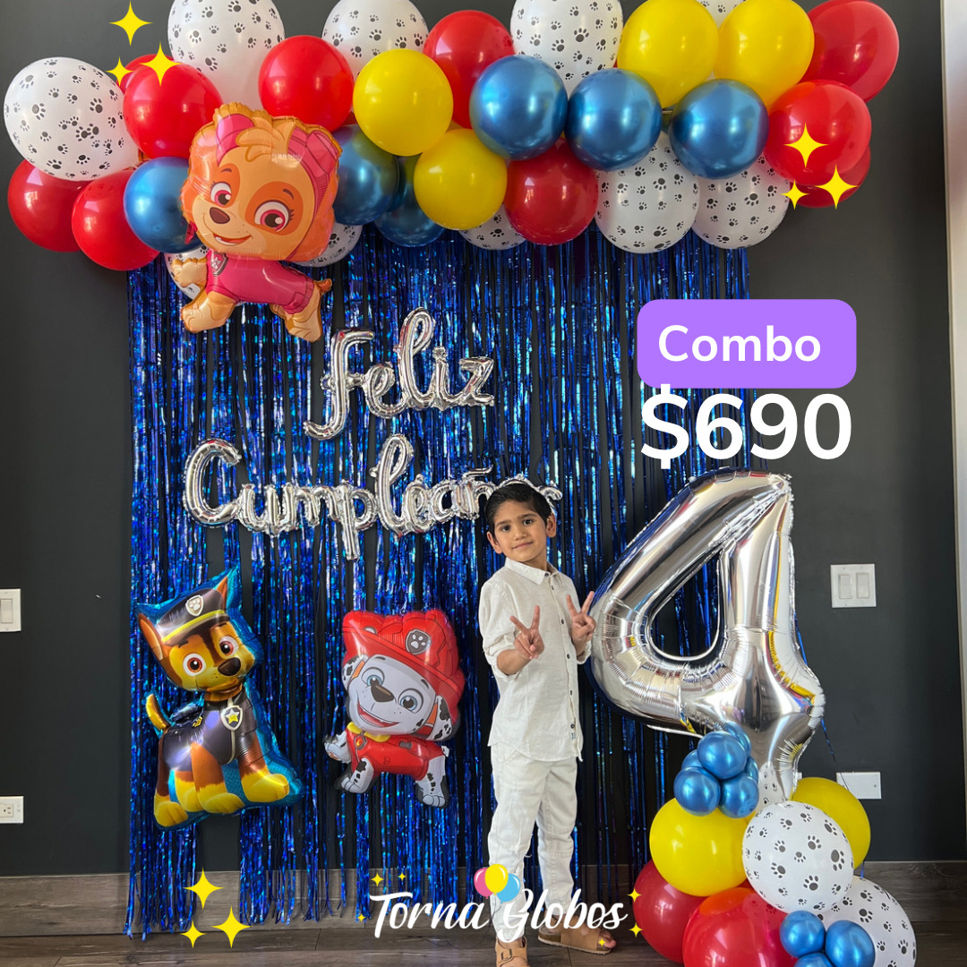 Este fantástico combo de cumpleaños de Paw Patrol con colores azul, rojo y plata es una opción emocionante y divertida para celebrar el cumpleaños de cualquier niño que ame la serie. A demás contiene a los personajes de esta serie y el numero del cumpleañero que hará mas emocionante la fiesta de ese pequeño.
